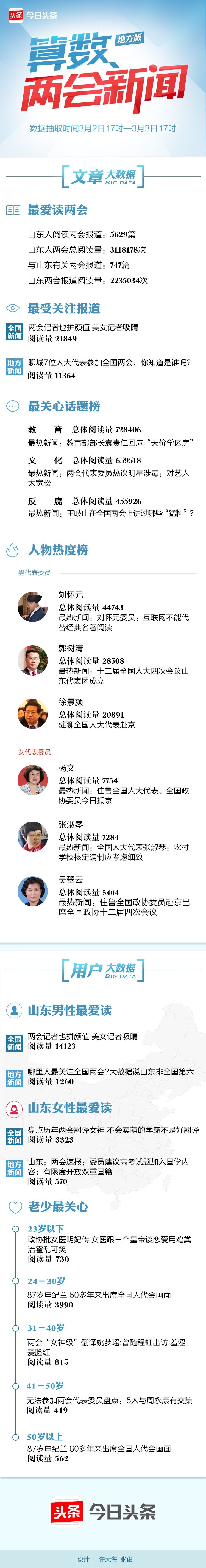 首先來看新聞報道方面的大數據,根據統計,在這短短24小時中,山東人兩會總閱讀量達到3118178次,閱讀兩會報道共計5629篇;與此同時,與山東有關的兩會報道有747篇,山東兩會報道閱讀量則高達2235034次。其中,閱讀量21849次的《兩會記者也拼顏值 美女記者吸睛》成為最受關注的全國新聞;最受關注的地方新聞則是《聊城7位人大代表參加全國兩會,你知道是誰嗎?》,閱讀量為11364次。
