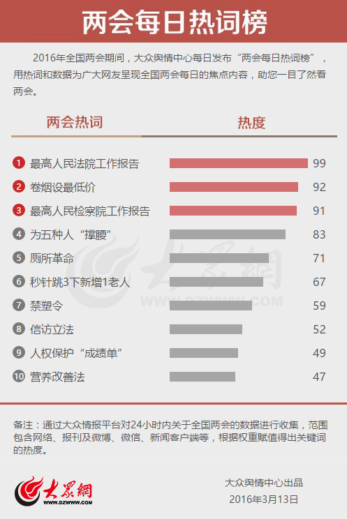 2016年全國兩會期間,大眾輿情中心每日發布“兩會每日熱詞榜”。通過大眾輿情平臺對24小時內關于全國兩會的數據進行收集,范圍包含網絡、報刊及微博、微信、新聞客戶端等,用熱詞和數據為廣大網友呈現全國兩會每天的熱點內容,助您一目了然看兩會。