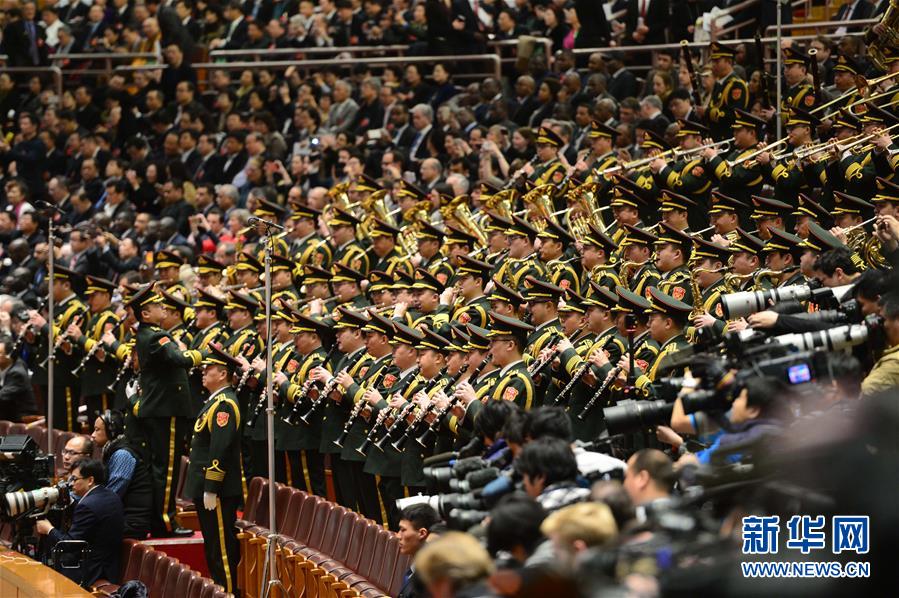 3月5日,第十二屆全國人民代表大會第四次會議在北京人民大會堂開幕。這是軍樂團高奏國歌。 新華社記者劉軍喜攝
