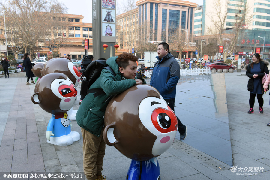 2014年01月29日,山東省濟(jì)南市,1月29日,濟(jì)南泉城路世茂廣場(chǎng)門(mén)前,72只孫悟空卡通形象集體亮相,七十二變鬧新春,成為街頭一道風(fēng)景線,市民游客紛紛駐足合影留念。圖片作者:豆芽菜/視覺(jué)中國(guó)