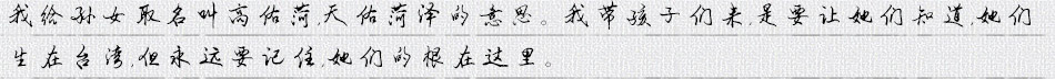我說心里很苦,是這些孫子輩的兒女對大陸的陌生,我的兒女,她們已經(jīng)對大陸沒有情感,對家鄉(xiāng)(沒有情感),她們是臺灣統(tǒng)一或獨(dú)立都可以。我是非統(tǒng)一不可,絕對沒有“獨(dú)立”兩個字。現(xiàn)在小孫女她們認(rèn)為臺灣和大陸是兩個國家。所以說你問我苦,我為什么這么苦,我苦就是說這樣下去,自然的就分裂了,越久越麻煩。所以我就感到到苦。