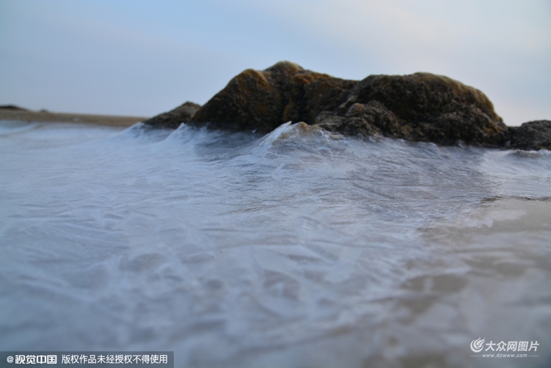 2016年1月18日,山東省日照市,海邊出現(xiàn)冰凌景觀。當(dāng)日是農(nóng)歷“四九”第一天,山東省氣象局發(fā)布天氣預(yù)報(bào):山東半島地區(qū)北風(fēng)5~6級(jí)陣風(fēng)7級(jí),夜間最低氣溫半島內(nèi)陸地區(qū)-10~-12℃。受冷空氣的影響,日照市沿海淺灘出現(xiàn)零星冰碴和冰凌,均以初生冰和冰皮為主,未對(duì)海洋養(yǎng)殖和漁船作業(yè)帶來(lái)影響。