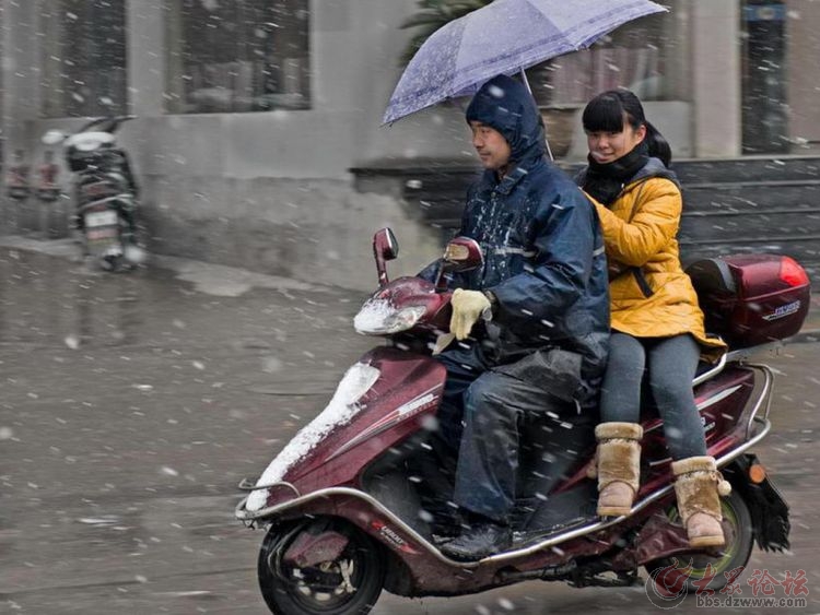 下雪天,老公騎車載著老婆,老婆給老公撐傘,溫情一刻。