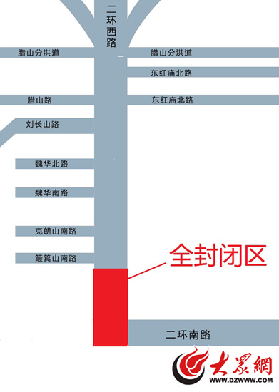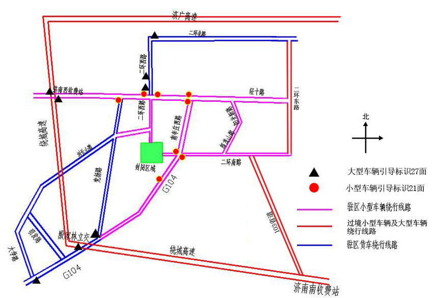 具體繞行路線為:經二環南路至二環西路的車輛建議繞行103省道至濟南南繞城高速,或至104國道黨楊路繞行;北向南車輛從二環北路至二環西路的車輛建議繞行濟南西繞城高速到104國道,或者沿經十路、黨楊路至104國道通行;西向南車輛,可以從濟南西收費站至104國道或二環南路,或者從經十西路、黨楊路至104國道或二環南路;南向北車輛,可以繞行固山收費站至經十西路、二環西路,或者從104國道、黨楊路至劉長山路延長線、二環西路。