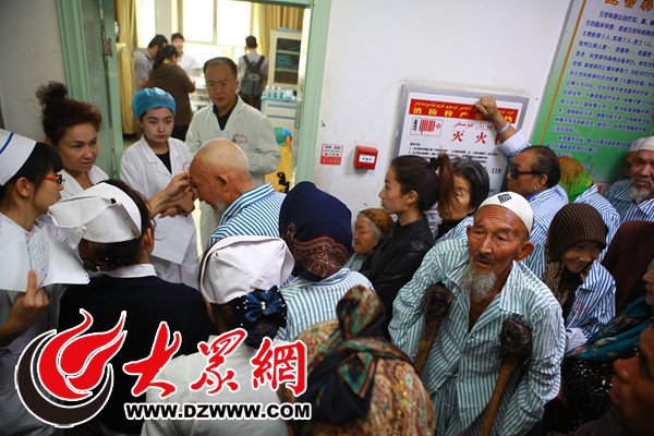 “喀什光明行”活動(dòng)經(jīng)過前期幾個(gè)月的籌備工作,8月30日如期走進(jìn)第一站麥蓋提縣人民醫(yī)院。當(dāng)天,天空中下著小雨,氣溫有些低,當(dāng)以山東大學(xué)第二醫(yī)院眼科主任張晗為核心的專家團(tuán)隊(duì)來到眼科門診的時(shí)候,走廊里站滿了人,門外的白內(nèi)障患者和家屬們滿臉焦急,早已排隊(duì)等候著專家做術(shù)前檢查和手術(shù)。專家團(tuán)隊(duì)稍做準(zhǔn)備后,立即進(jìn)入工作狀態(tài)。人群一側(cè),一位身穿病號服的老奶奶引起了記者的注意,老人貼墻而站,沒有任何人陪伴,和人群保持了一定距離,和旁邊被左右家屬攙扶的白內(nèi)障老人們比起來顯得尤為孤獨(dú)。記者好奇的走了過去,因?yàn)檎Z言不通,所以需要憑借醫(yī)院護(hù)士的翻譯,在簡單的了解后,老人的遭遇令記者深感同情。圖為白內(nèi)障患者等待著山大二院專家做術(shù)前檢查。王厚江 攝影