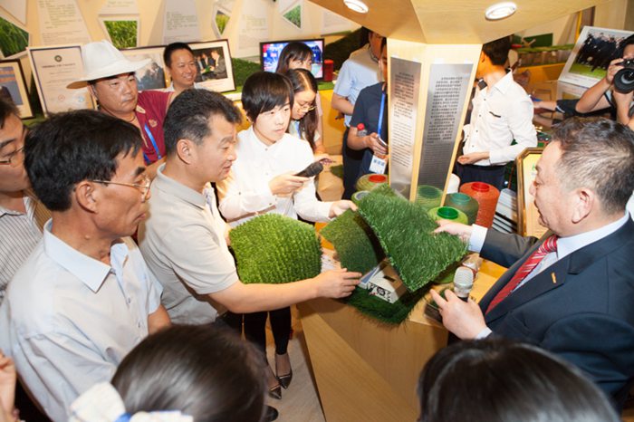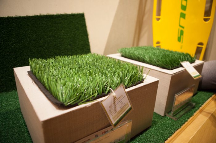 泰山體育集團自主研發生產的可釋放負離子的人造草,此項目已被列入了國家火炬計劃。(撒偉 攝)