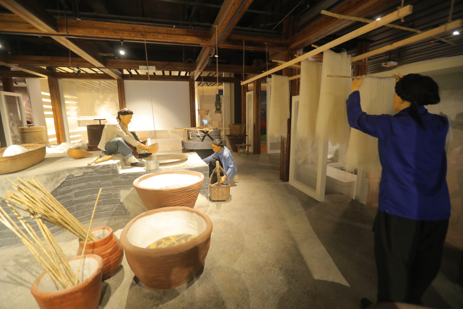 中國龍口粉絲博物館休閑體驗區(qū)布局以明、清時期膠東古民居為主體,廣泛征集地方民俗及粉絲作坊器具,按影視基地模式建設。完整復原古代粉絲生產(chǎn)工藝、粉絲外運、粉絲銷售、生活休閑等場景。