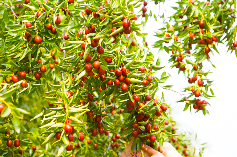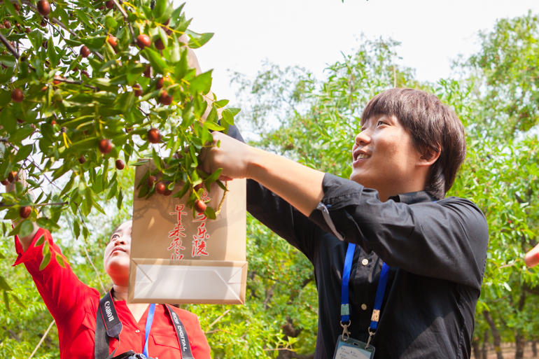 隨手摘下一顆熟透了的紅棗塞進(jìn)嘴里,記者們立刻被樂(lè)陵小棗特有的香甜俘虜,一邊向棗林深處漫步,一邊摘下更多的甜蜜放到舌尖(撒偉 攝)
