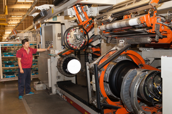 寶通輪胎最大的特點是“智能化”,機器把扁扁的橡膠“吹”成鼓鼓的輪胎(撒偉 攝)