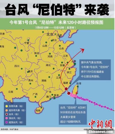 據(jù)中央氣象臺預計,“尼伯特”登陸后將會經(jīng)華東地區(qū)北上,可能影響山東半島甚至遼東半島,陸上滯留時間長達60小時。對此,中央氣象天首席預報員張濤表示,滯留時間越長,影響范圍也會越大。預計從7月8號至11號,臺灣及閩、浙、贛、蘇、滬、皖等7省市將有強降雨天氣。