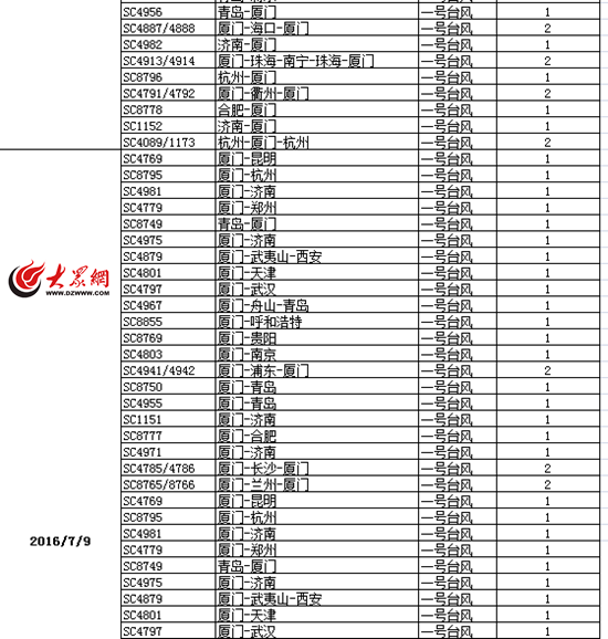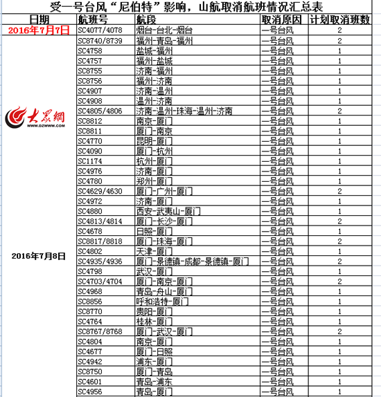 受一號臺風“尼伯特”影響,山航取消航班情況匯總表。