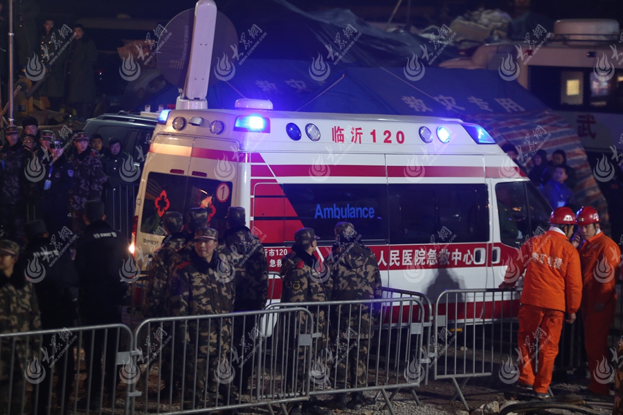 1月29日晚,平邑“12.25”石膏礦坍塌事故救援現(xiàn)場(chǎng)救護(hù)車(chē)嚴(yán)陣以待。(大眾網(wǎng)攝影師王鈞生 攝)