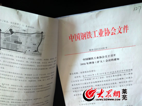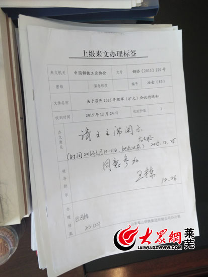 王守東批閱的關(guān)于參加中國鋼鐵協(xié)會(huì)會(huì)議的文件(記者 亓秀寶 攝)