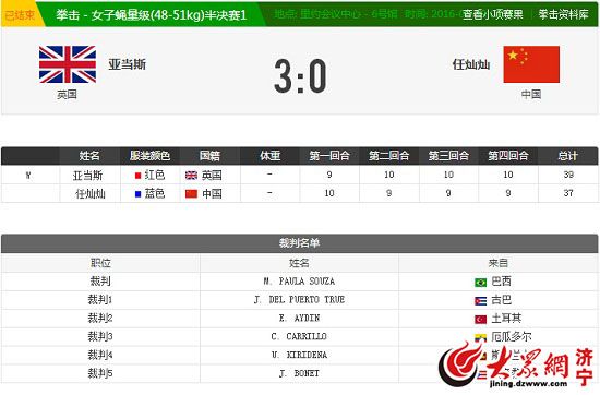 大眾網濟寧8月19日訊(記者 朱仙娉 史欣欣)在剛剛結束的2016里約女子拳擊51公斤級半決賽中,帶傷上場的中國選手任燦燦以總比分37:39輸給老對手英國選手亞當斯,止步半決賽,收獲銅牌。