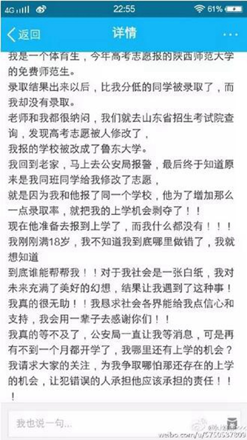 然后7月23日這天,這報考的這一批次的征集志愿下來了,這時候,他才驚訝的發現,征集志愿中,竟然有一個陜西師范大學免費師范生的名額。他的同學比他分數低,都被陜西師范大學錄取了,而他的分數還要高一些,竟然沒被錄取,而且,根本就沒有招滿。學校沒招滿,還不錄取分數足夠的他,這是為什么?于是,他這才想起來去查閱自己的報考記錄,結果讓他大吃一驚。他根本就沒有報陜西師范大學,他的記錄,被改成了魯東大學的體育休閑教育專業。