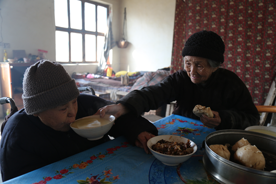 2012年,大兒媳突然得了重病。經(jīng)過(guò)治療,雖然挽回了生命,生活卻再也不能自理。大兒子家庭貧寒,依靠幾畝薄田度日。孫子孫媳都有工作,曾孫還在求學(xué)。兒媳沒(méi)人照顧,80多歲的高丕英毅然接過(guò)了照顧兒媳的重任。因?yàn)榘c瘓,兒媳婦內(nèi)心焦慮,經(jīng)常對(duì)她發(fā)牢騷,高丕英卻無(wú)怨無(wú)悔,還時(shí)常寬慰她。每天早晨,她得親自做好飯,一勺一勺喂到兒媳嘴里,已是84歲高齡的她,動(dòng)作不再敏捷,眼睛也有些昏花,有時(shí)候拿勺子的手會(huì)顫抖,甚至?xí)䴙⒊鰜?lái)。但喂兒媳婦的一日三餐,一頓也沒(méi)落下過(guò)。
