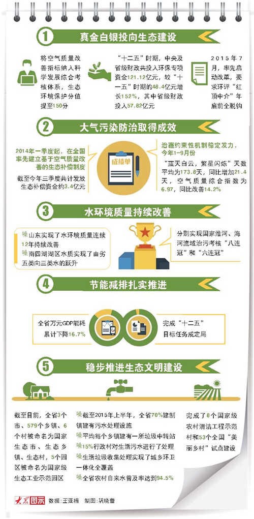 十二五期間,齊魯大地水在變清、天在變藍(lán),人民生活環(huán)境逐步改善,美麗山東圖景逐漸顯現(xiàn)。同時,在既具前瞻性又是硬約束的多項創(chuàng)新性政策、標(biāo)準(zhǔn)引導(dǎo)下,山東經(jīng)濟轉(zhuǎn)調(diào)得到促動和護(hù)力,整體經(jīng)濟趨向更加生機盎然的綠色可持續(xù)。