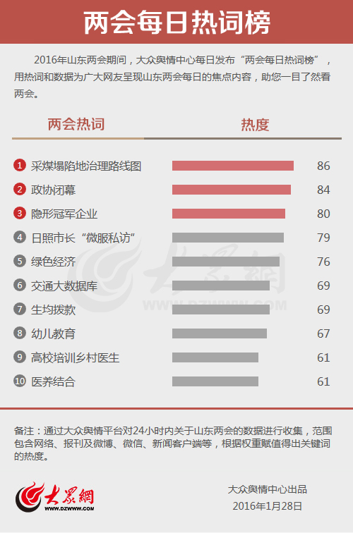 2016年山東兩會(huì)期間,大眾輿情中心每日發(fā)布“兩會(huì)每日熱詞榜”。通過大眾輿情平臺(tái)對(duì)24小時(shí)內(nèi)關(guān)于山東兩會(huì)的數(shù)據(jù)進(jìn)行收集,范圍包含網(wǎng)絡(luò)、報(bào)刊及微博、微信、新聞客戶端等,用熱詞和數(shù)據(jù)為廣大網(wǎng)友呈現(xiàn)山東兩會(huì)每天的熱點(diǎn)內(nèi)容,助您一目了然看兩會(huì)。