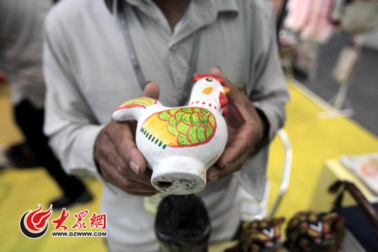 山東濟寧鄒城唐村鎮西田村的惠計光在濟寧展區展示失傳已久的泥咕咕。記者 馬俊驥 攝