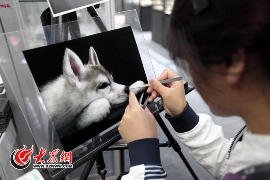 威海展區展示了絲綿畫技藝和省級非物質文化遺產錫鑲技藝。絲綿畫用天然棉花或纖維為原材料,采用撕、拉、搓、捻等工藝技法將染色好的棉花纖維進行梳理和調色,依靠棉花纖維的自然附著力,用鑷子和手指一絲一絲的純手工將纖維進行平鋪、疊加、壓實等,創造出的畫立體感強,色彩細膩豐富。大眾網記者看到,絲綿畫創作的風景畫有極強的紋理感,非常生動,創作的動物畫更是栩栩如生,仿佛畫面中的動物須發皆張,活靈活現。