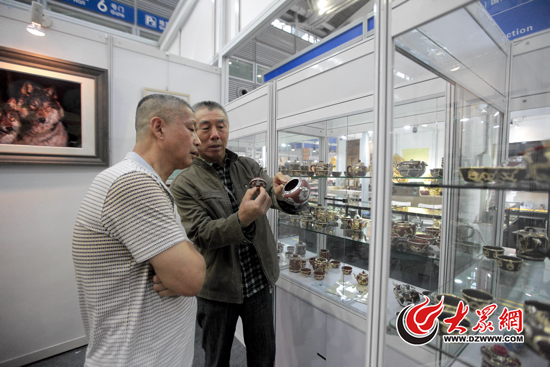 威海錫鑲技藝已有近百年歷史,制作者用小錘子和小鑿子在薄如紙片的錫片上無數次錘打鑿刻,勾勒出動物、風景等圖畫,然后或者保留原色、或者鍍金,再鑲嵌在紫砂壺、瓷器、玉器等器物之上。錫鑲之后的器物顯得雍容華貴,給原本平淡的器物平添了幾分靈氣。技藝傳承人李江玉和谷偉在現場演示和介紹該項技藝,現場展示的錫嵌茶具等作品雖然售價不菲,但是仍不斷吸引觀眾和采購商前來購買、詢價。