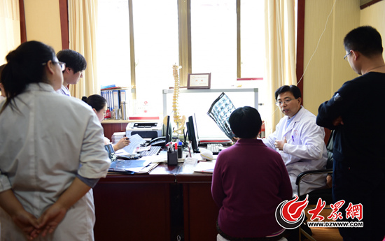 在濟南市經(jīng)十路18877號,有一所名為山東省醫(yī)學科學院頸肩腰腿痛醫(yī)院的中醫(yī)骨科醫(yī)院,這家醫(yī)院因不做手術就能神奇地解除頸椎、腰椎病痛為人們所熟知,每天都有許多全國各地慕名前來求醫(yī)的患者。4月15日,在該院二樓的中醫(yī)骨傷科門診室里,像往常一樣,該院院長師彬在患者和徒弟們十幾人的包圍中,聚精會神地看著患者陳蘭(化名)的脊椎影像片子。