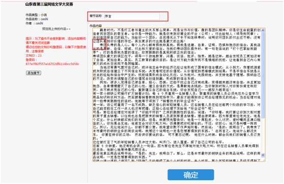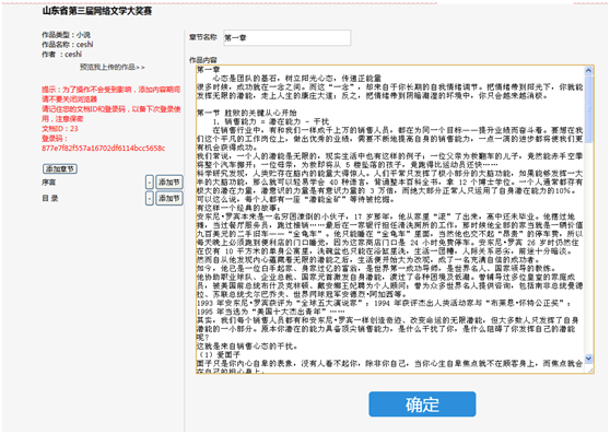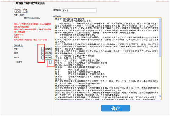 1、文章錄入以“章”“節(jié)”進(jìn)行斷分,“章”下可增、減小節(jié),點(diǎn)擊“添加章節(jié)”錄入第一章內(nèi)容,粘貼后會(huì)總動(dòng)保存分段格式,段前空格無(wú)需自行編輯,文章頁(yè)面會(huì)自動(dòng)呈現(xiàn)段前空格。內(nèi)容錄入完成后點(diǎn)擊“確定”提交。請(qǐng)務(wù)必錄入“章節(jié)名稱”,否則易造成提交失敗。無(wú)誤后點(diǎn)擊頁(yè)面下方確定。