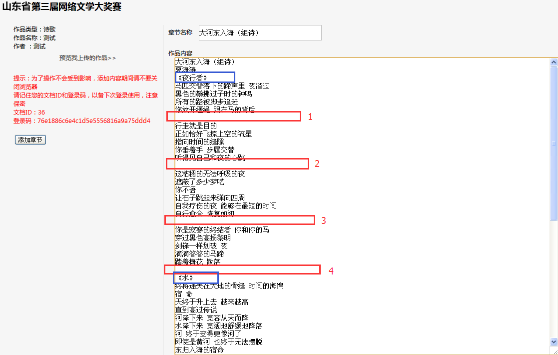 組詩(shī)在投稿過(guò)程中,每組詩(shī)可在一章的頁(yè)面下提交,需自行編輯空出詩(shī)中的段距、每首詩(shī)之間的段距(如紅框1、2、3、4,按“enter”健即可),每首詩(shī)的標(biāo)題請(qǐng)加書名號(hào)(如下圖藍(lán)框)。