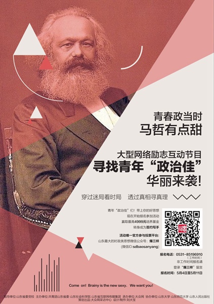 大眾網濟南5月3日訊記者 王磊)在“五四”青年節來臨之際,共青團山東省委、山東社會科學院、山東省互聯網傳媒集團等單位聯合推出大型網絡勵志互動節目——尋找青年“政治佳”,5月4日正式啟動。活動面向全省高校、理論研究機構、社會團體中的理論學習骨干、優秀大學生進行海選,最終選出具有培養潛質的理論學習先進青年,實施一系列的培養計劃。參與者不僅將有機會獲得一定數額的理論培養基金,還將有權威、高端的導師團對其進行全程專業指導。