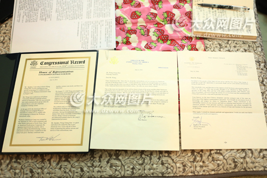 聽說瑪麗要到中國探望“最后一位英雄”,十幾位被從濰縣集中營解救出來的難友給王成漢寫來了感謝信,并托瑪麗親手轉交。美國國會議員唐納德·諾克羅斯(U.S. Rep Donald Norcross)因王成漢的“無私的行為與貢獻”將其姓名寫進了國會記錄,旣悓⑦@些信件親手交到王成漢手中,兩位老人戴上老花鏡,認認真真地翻看起來。王成漢用顫抖的手指撫摸著這些信件,忍不住輕輕讀出了聲。