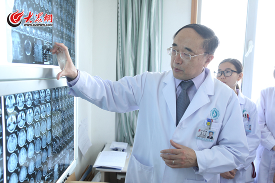 于金明院長在認真查看病人的腦電圖。(亓翔 攝)