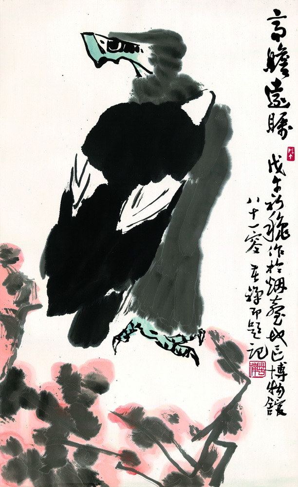 高瞻遠(yuǎn)矚 尺寸:82.3×50.4 款識:高瞻遠(yuǎn)矚。戊午初秋作于煙臺地區(qū)博物館。八十一叟苦禪即題記