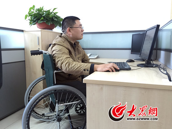 2015年11月2日,無腿青年吳洪飛第一天來到山東省人力資源社會保障信息中心上班,他也是2015年山東省直單位通過公開招考錄用的唯一一名重度殘疾人。