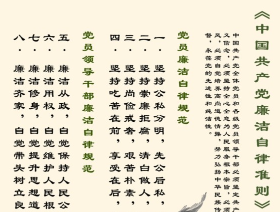編者按:近日,中共中央印發了《中國共產黨廉潔自律準則》(以下簡稱《準則》),并發出通知,要求各地區各部門認真遵照執行。《中國共產黨廉潔自律準則》全文如下: 中國共產黨全體黨員和各級黨員領導干部必須堅定共產主義理想和中國特色社會主義信念,必須堅持... [詳細]