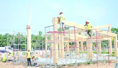 德州新聞網(wǎng)訊(記者 王志冕)7月18日上午,來(lái)自北京建筑大學(xué)、香港大學(xué)的魯班柱和紫荊花聯(lián)隊(duì)為參賽作品斯陋宅上梁。“再有兩天,房屋主體就能完工了。 ”賽隊(duì)指導(dǎo)教師、北京建筑大學(xué)博士徐榮吉說(shuō)。