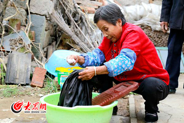 貧困戶陳淑芳與郭公正結(jié)成互助對(duì)子,洗衣服、打掃衛(wèi)生,照顧爺倆日常起居。(大眾網(wǎng)記者 鄒慧 攝)