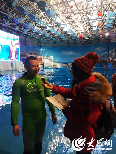 因為馬上就要演出了,在采訪結束后,郭曉東匆匆換上了潛水服,他和搭檔琪琪馬上又要為臺下的觀眾表演了。