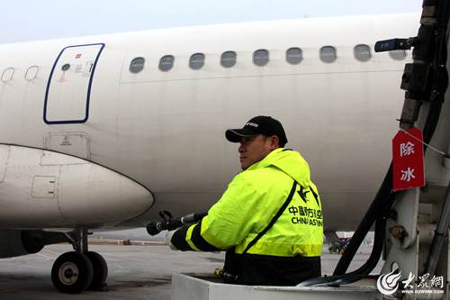 1月18日早晨7時許,氣溫跌破零下4度,青島流亭機場停機坪內,東航機務維修人員凌學偉正操控著移動工作梯,時上時下,將噴頭瞄準一架飛機的機翼、機身除冰霜。