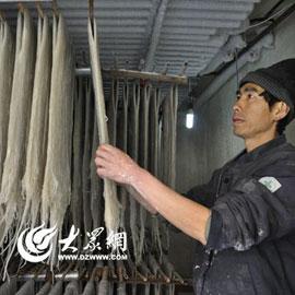 1月16日上午10點,陽光灑在青島溫涼河兩岸的楊樹林里,膠州市洋河鎮大相家村的村民們正踩著落葉晾曬著粉條,白亮亮的粉條讓歲末年初的農閑時光變成了農忙時間。膠州洋河鎮大相家村是遠近聞名的“粉條村”,加工紅薯粉條已經有近300年的歷史。每年農歷大雪節氣后,村... [詳細]