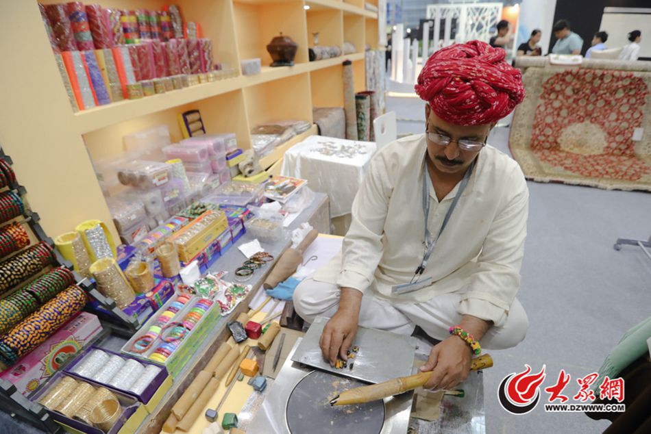 7號館“一帶一路·國際館”呈現出中西文化交相輝映,古老技藝與現代創意激烈碰撞的場景。圖為印度展區一位印度工匠盤膝而坐,手持木棒在爐子上來回翻滾,制作手環。大眾網記者 王長坤 攝