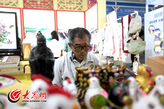 位于2號館的濟寧、威海展區(qū)雖然面積小了不少,但是展示亮點和對觀眾的吸引力一點也不遜色。作為孔子誕生地,濟寧將孔子文化特色發(fā)揮得淋漓盡致。在展廳入口處,一尊半人高的孔子雕像引人注目,展廳內展示的也多是與儒家文化有關的文化產品,無不透露著深厚的歷史底蘊。濟寧的民間藝人還將非物質文化遺產魯錦技藝、古兵器制作和西田泥咕咕等帶到了現場。