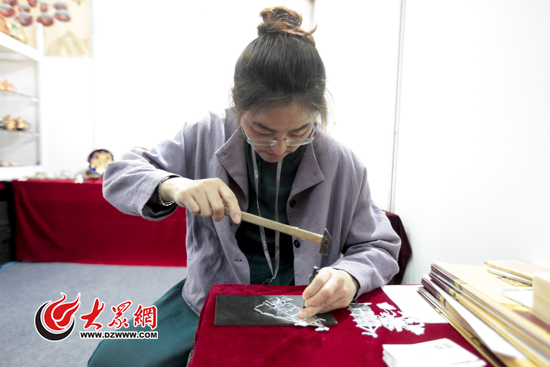 威海錫鑲技藝已有近百年歷史,制作者用小錘子和小鑿子在薄如紙片的錫片上無數次錘打鑿刻,勾勒出動物、風景等圖畫,然后或者保留原色、或者鍍金,再鑲嵌在紫砂壺、瓷器、玉器等器物之上。錫鑲之后的器物顯得雍容華貴,給原本平淡的器物平添了幾分靈氣。技藝傳承人李江玉和谷偉在現場演示和介紹該項技藝,現場展示的錫嵌茶具等作品雖然售價不菲,但是仍不斷吸引觀眾和采購商前來購買、詢價。
