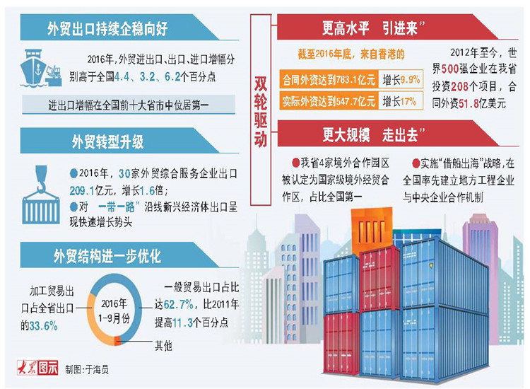 數(shù)據(jù)顯示:2016年,30家外貿(mào)綜合服務(wù)企業(yè)出口209.1億元,增長1.6倍,拉動(dòng)全省出口增長1.4個(gè)百分點(diǎn);跨境電子商務(wù)出口477.6億元,增長45.3%,拉動(dòng)全省出口增長1.7個(gè)百分點(diǎn);對“一帶一路”沿線新興經(jīng)濟(jì)體出口呈現(xiàn)快速增長勢頭。