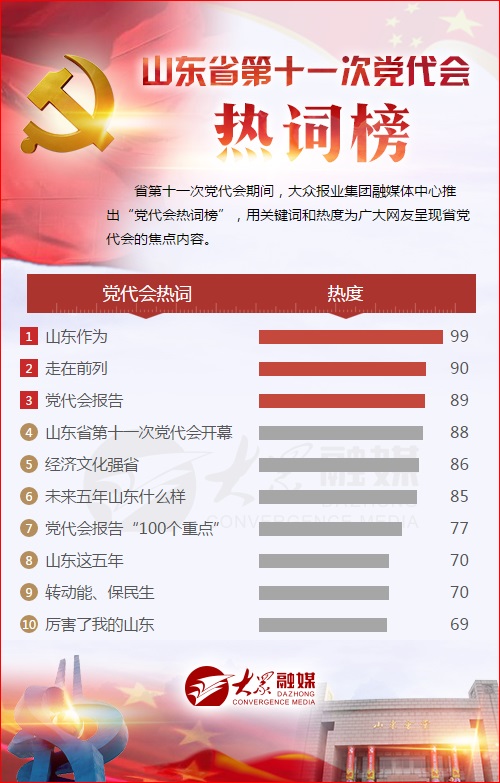 大眾網(wǎng)濟(jì)南6月16日訊 自省第十一次黨代會(huì)開(kāi)幕以來(lái),社會(huì)關(guān)注度持續(xù)升溫,根據(jù)大眾情報(bào)平臺(tái)顯示,“山東作為”、“走在前列”、“黨代會(huì)報(bào)告”,分別以99、90、89的熱度成為黨代會(huì)期間排名前三的熱詞。
