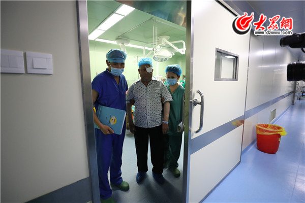 7月21日一早,山東大學第二醫院眼科主任張晗來到艾買爾·托合提病床前,為其揭開紗布。此刻的艾買爾·托合提在睜開眼睛的一瞬間,可以重見光明。揭開紗布后的艾買爾·托合提激動地說道:“亞克西,太棒了!終于看清楚為我手術的山東專家了,太感謝你們了”。攝影/王厚江