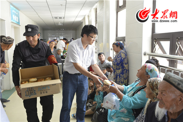 山東援疆醫(yī)生、疏勒縣人民醫(yī)院院長王浩為等待篩查的維族同胞們發(fā)放了馕和礦泉水等免費(fèi)午餐