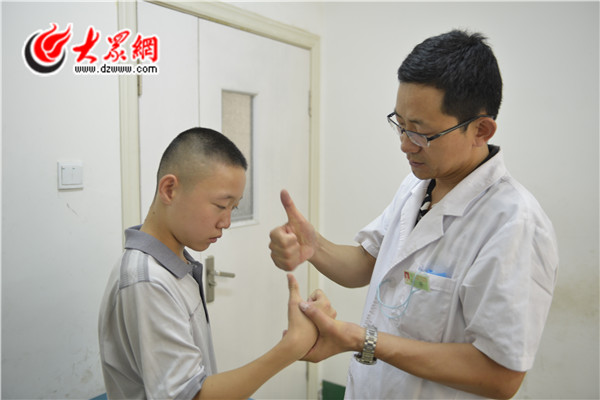 山大二院醫務部副主任、兒外科專家王若義為去年術后腦癱患兒做康復檢查