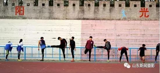 在郯城一中采訪時(shí)已是下午的4點(diǎn)多鐘,校園體育場上人來人往,籃球場上同學(xué)縱身一躍 閃轉(zhuǎn)騰挪,舉重場上同學(xué)從容不迫力拔千斤,多功能場上歡聲笑語,正上演老鷹捉小雞,最耀眼就是足球場,一群身著橘紅色的足球女隊(duì)員正在訓(xùn)練,郯城一中女子足球隊(duì),業(yè)余的教練,本校的學(xué)生,無名師,無大牌,發(fā)軔于熱愛,成長于快樂,憑戰(zhàn)績展聲威;赝@支隊(duì)伍的足跡,是一串連續(xù)三年獲得全國前三名的傲人戰(zhàn)績;在省內(nèi),建隊(duì)九年來,五次斬獲全省冠軍,2次獲得亞軍。在拍攝女子足球的同時(shí),我看到一群正在做準(zhǔn)備活動(dòng)的同學(xué),背景是長城樣式的看臺(tái),上面寫著陽光字樣,做準(zhǔn)備活動(dòng)的同學(xué)動(dòng)作各異,在紅色跑道襯托下形式感很強(qiáng),我迅速用長焦連續(xù)拍攝三張,剛拍完同學(xué)們就集合開始了訓(xùn)練。后期對照片進(jìn)行上下裁剪。