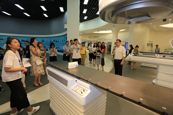 在放射診療專區,采訪團記者們看到了3臺放射診療設備。“這臺機器是大孔徑螺旋CT,目前全球僅有兩家公司能夠制作,一家是飛利浦,另一家就是新華醫療。我們的產品推出后,將打破行業壟斷,促使國外產品的價格從700萬元降到500萬元。”放射診療市場部部長王波向采訪團記者們介紹說。
