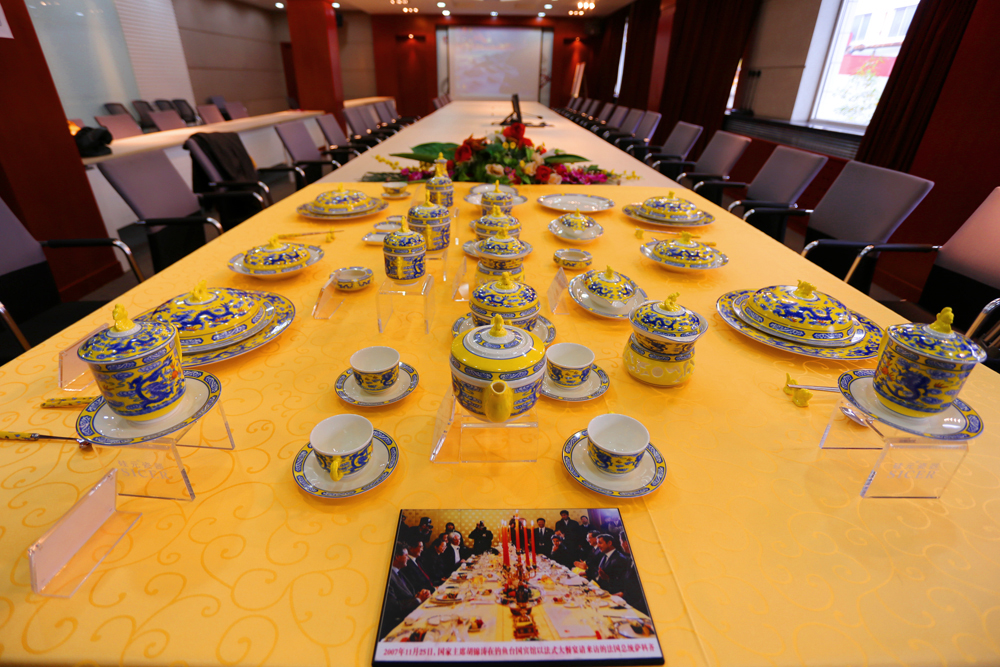 “1999年初,釣魚臺(tái)國賓館在全國范圍內(nèi)遴選國宴用瓷,各大陶瓷產(chǎn)區(qū)的知名陶瓷企業(yè)都參與了。硅元以陳貽謨?yōu)榇淼脑O(shè)計(jì)人員,參考中國歷代古瓷珍品,靈活運(yùn)用民族元素,突出硅元瓷器的材質(zhì)和釉料優(yōu)勢,研發(fā)設(shè)計(jì)了中華龍系列產(chǎn)品。”殷書建對(duì)記者介紹說。1999年9月份,建國50周年大慶前夕,中華龍產(chǎn)品從全國各大陶瓷產(chǎn)區(qū)脫穎而出進(jìn)入釣魚臺(tái)國賓館等地。